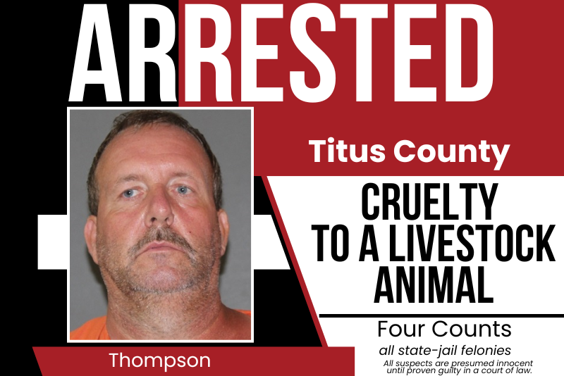 Several TCSO patrol deputies and investigators executed the warrant and later arrested Timothy Thompson, 52, of Titus County, for the offense of Cockfighting, a state-jail felony. Based on information observed by deputies during the execution of the search warrant, Thompson was also arrested on four counts of Cruelty to a Livestock Animal, also state-jail felonies.